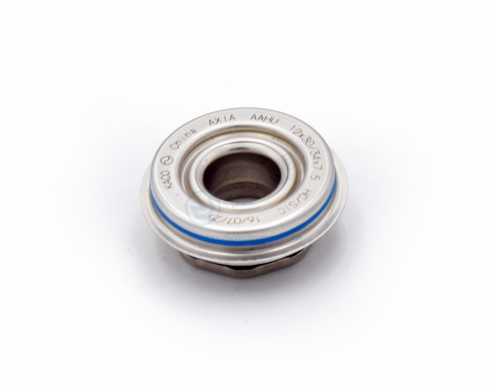 汽車(chē)發(fā)動(dòng)機冷卻水泵用機械密封,簡(jiǎn)稱(chēng)水封,主要由兩部分組成:動(dòng)環(huán)部件和靜環(huán)部件。靜環(huán)部件安裝在泵殼上,在實(shí)際使用過(guò)程中處理靜止狀態(tài);動(dòng)環(huán)部件安裝在軸承上,在實(shí)際使用過(guò)程中隨軸承一起運轉。其動(dòng)密封介質(zhì)為一對摩擦環(huán)(動(dòng)環(huán)、靜環(huán)),并通過(guò)底部的彈簧對密封端面預緊和提供軸向壓力進(jìn)行補償。